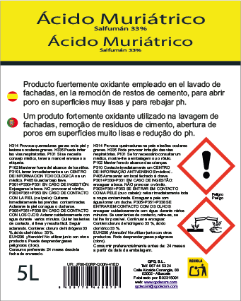 Producto fuertemente oxidante de carácter corrosivose emplea en el lavado de fachadas y en la remoción de restos de cemento y para abrir poro en superficies muy lisas en las que se pueden dar problemas de adherencia en el pintado.